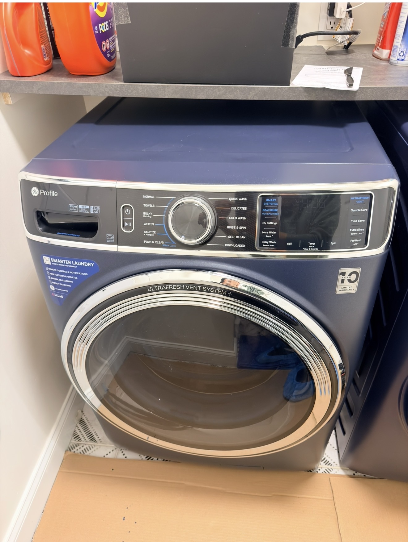 The problem is that most owners have never opened that panel. GE includes filter cleaning instructions in the owner's manual, but the manual is filed away after installation and rarely consulted again. Over one, two, three years of regular use, the filter accumulates a dense plug of debris. When it restricts flow enough that the drain pump can't empty the drum within GE's timing window, the Ld or F9E1 error appears — the machine stops mid-cycle with a tub full of water.